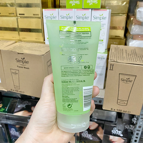 • Sữa Rửa Mặt Simple Dạng Gel : KHÔNG có nước hoa hoặc màu nhân tạo, KHÔNG có hóa chất mạnh, KHÔNG cồn, KHÔNG xà phòng, KHÔNG paraben và KHÔNG phthalates.